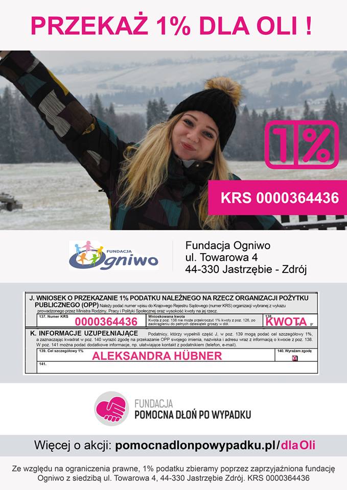 Fundacja oraz znajomi organizują zbiórki pieniędzy na kosztowną rehabilitację Oli Hubner. Oli. Wpłat można dokonywać bezpośrednio na konto: Fundacja Pomocna Dłoń Po Wypadku plac Wolności 19, 44-200 Rybnik Bank Millennium 95 1160 2202 0000 0003 3836 6522.